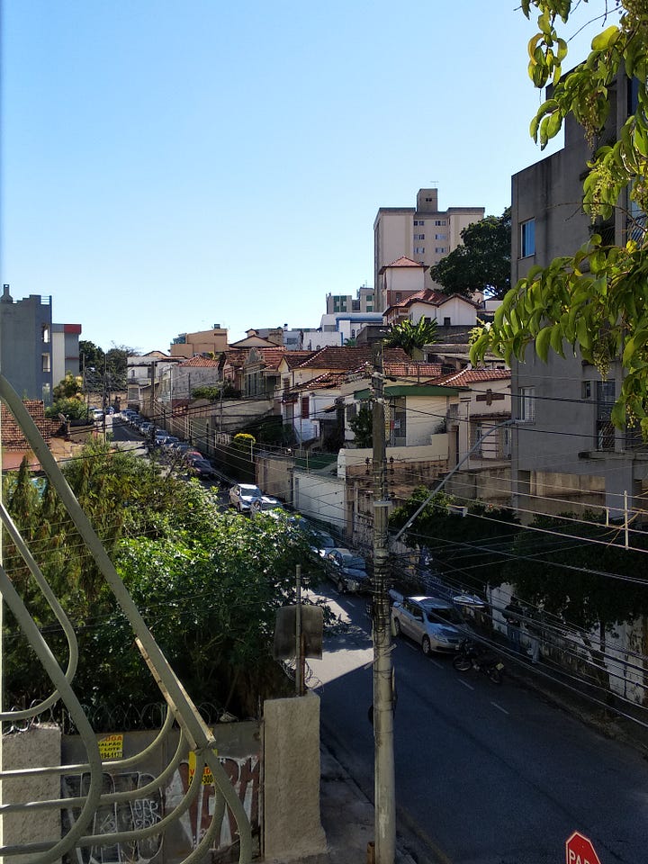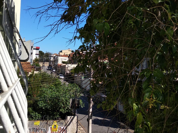 Voltei com chuvisco na cabeça, isso foi bom. Adoro a rua que eu desço voltando do supermercado, a Januária. No comecinho do seu quarteirão sem saída, numa parte mais alta, a gente tem uma vista linda do centro. Dá pra ver os prédios enfileirados em uma rua comprida que sobe toda vida na mesma direção da que a gente está até sumir no horizonte: é a rua da Bahia.