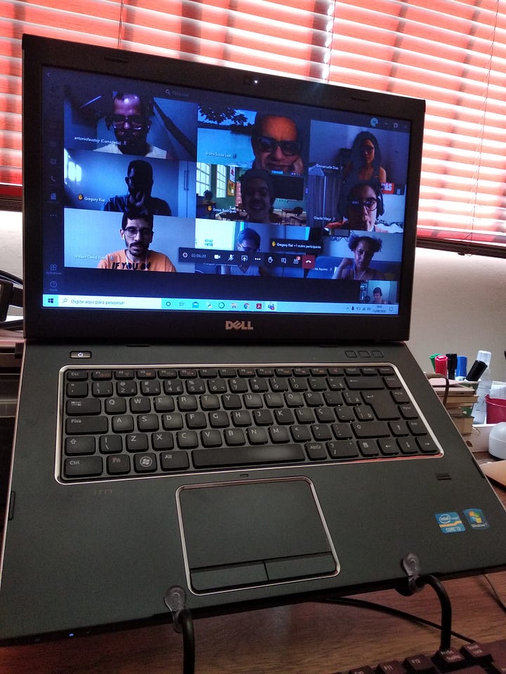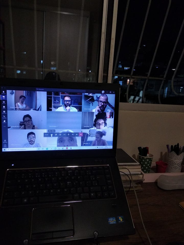 Mas caio. Não caía durante uma aula há muito tempo, desde criança quando tentava alcançar um lápis no chão sem sair da carteira. Atualmente, a queda ficou comum: toda aula tem seu alvo, a pessoa que cai em sequência. Aproveito a queda involuntária para ir até a cozinha e tomar um copo de água: “Caiu né?”, o Douglas comenta quando passo por ele na sala também às voltas com a internet ruim. Desligo e religo o roteador, vou ao banheiro e logo volto ao quarto e à postura de antes. Certa tensão toma conta do corpo, uma disciplina do ritual de assistir à aula que se mistura à necessidade de ficar dentro do enquadramento da câmera e, ainda, ao fato de passar muito tempo sentada. A turma inteira está organizada em fileiras horizontais na minha frente e eu tenho acesso aos seus rostos durante todo o tempo, inclusive ao meu próprio. A tela mostra, ininterruptamente, como nós assistimos às aulas, um filme de baixa nitidez e com atrasos, receita certa para a paranoia.